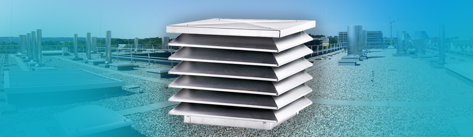 The louvered hood (DHE/LH) is a square roof hood designed for outdoor air intake and exhaust air discharge in HVAC systems. In its driving-rain-proof version (DHE/LH-SRS), it is frequently used for the ventilation of sensitive technical areas such as server rooms, control cabinets, or cleanrooms for semiconductor manufacturing. It reliably protects against moisture wherever any water ingress must be avoided, even when condensate drainage is provided in the downstream duct system.